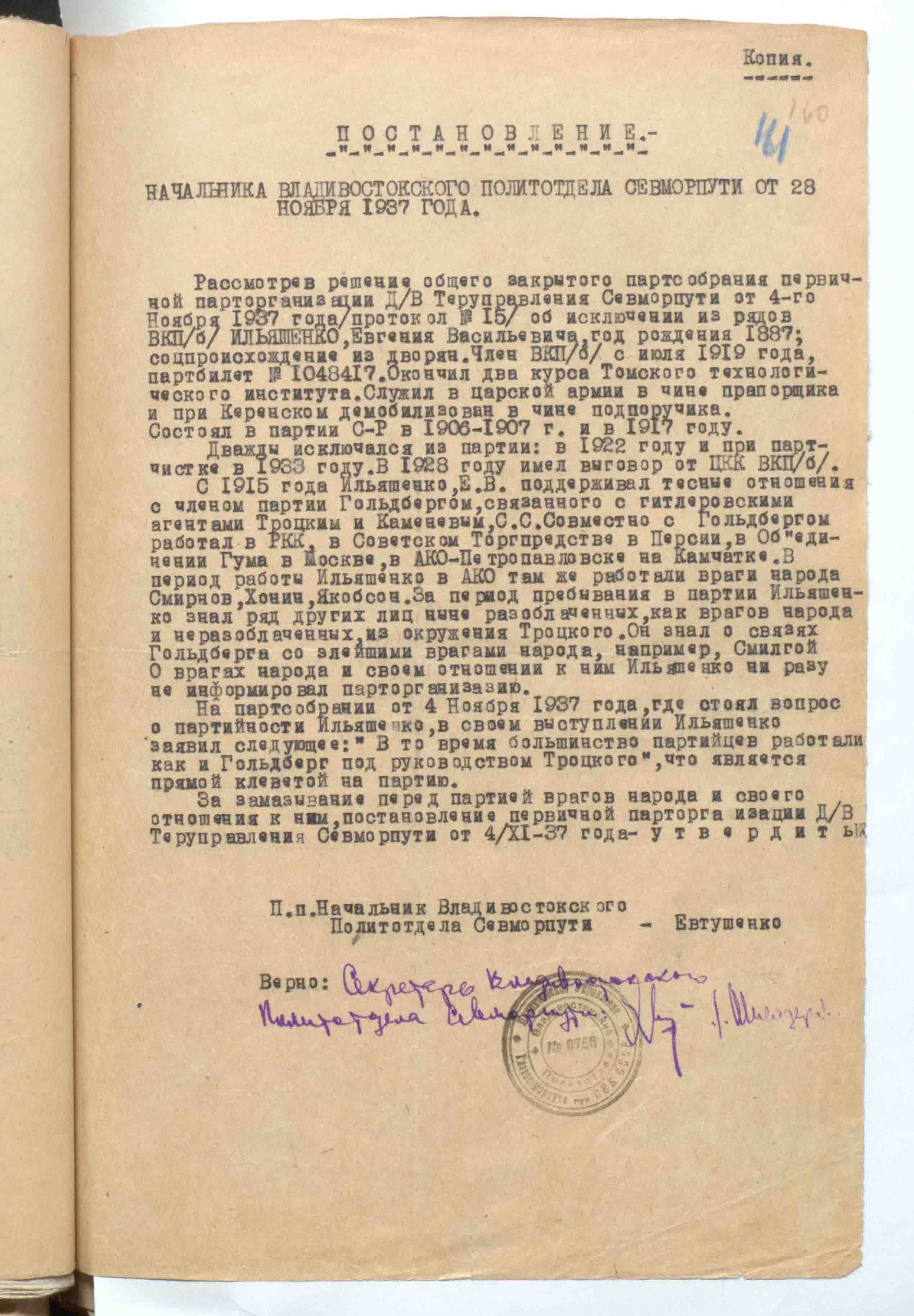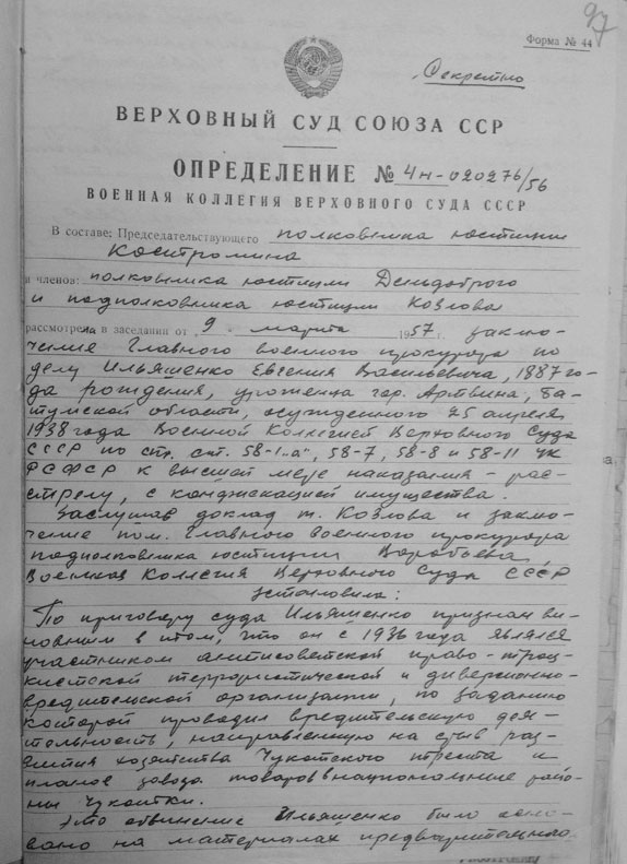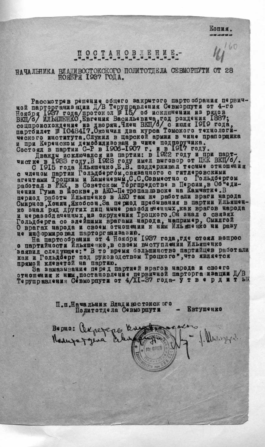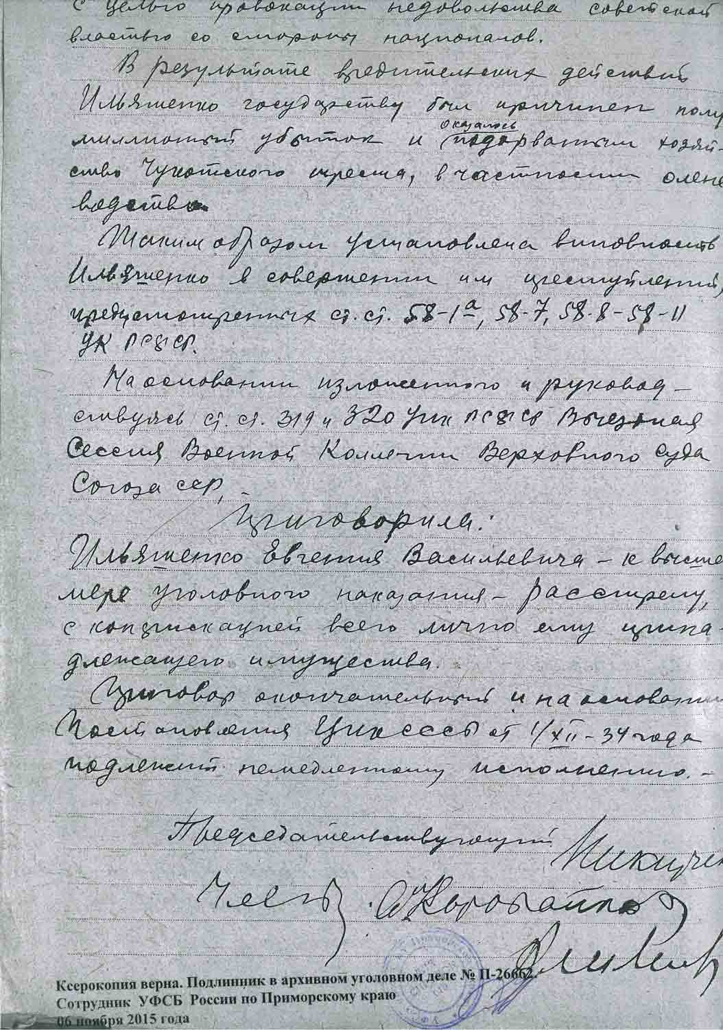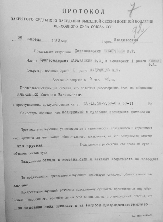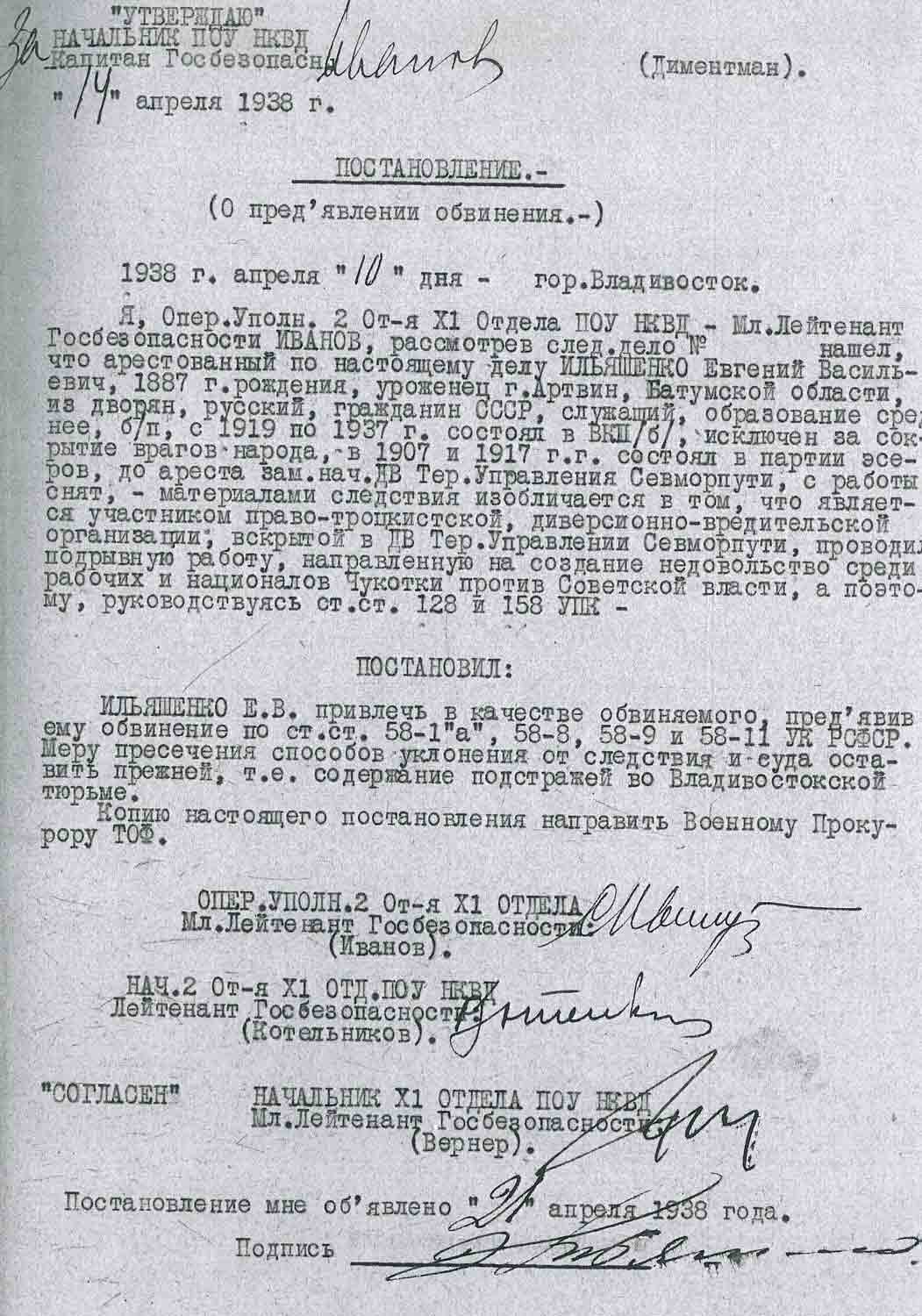 Рассмотрев решение общего закрытого партсобрания первичной парторганизации Д/В Теруправления Севморпути от 4-го ноября 1937 года/протокол № 15/ об исключении из рядов ВКП (б) ИЛЬЯШЕНКО Евгения Васильевича, год рождения 1887; соцпроисхождение из дворян. Член ВКП (б) с июля 1919 года, партбилет «1 048 417. Окончил два курса Томского технологического института. Служил в царской армии в чине прапорщика и при Керенском демобилизовался в чине подпоручика. Состоял в партии С-Р в 1906—1907 гг. и в 1917 году.