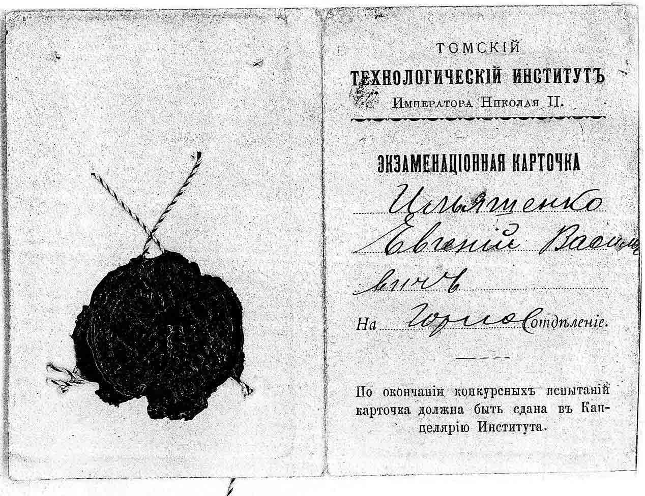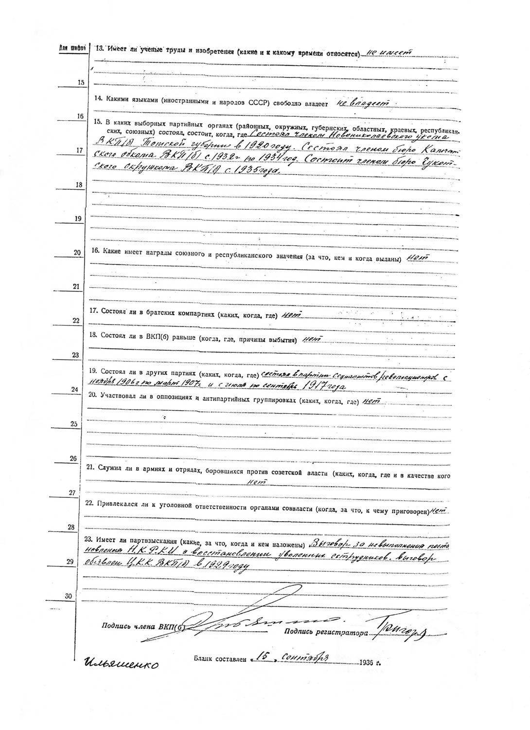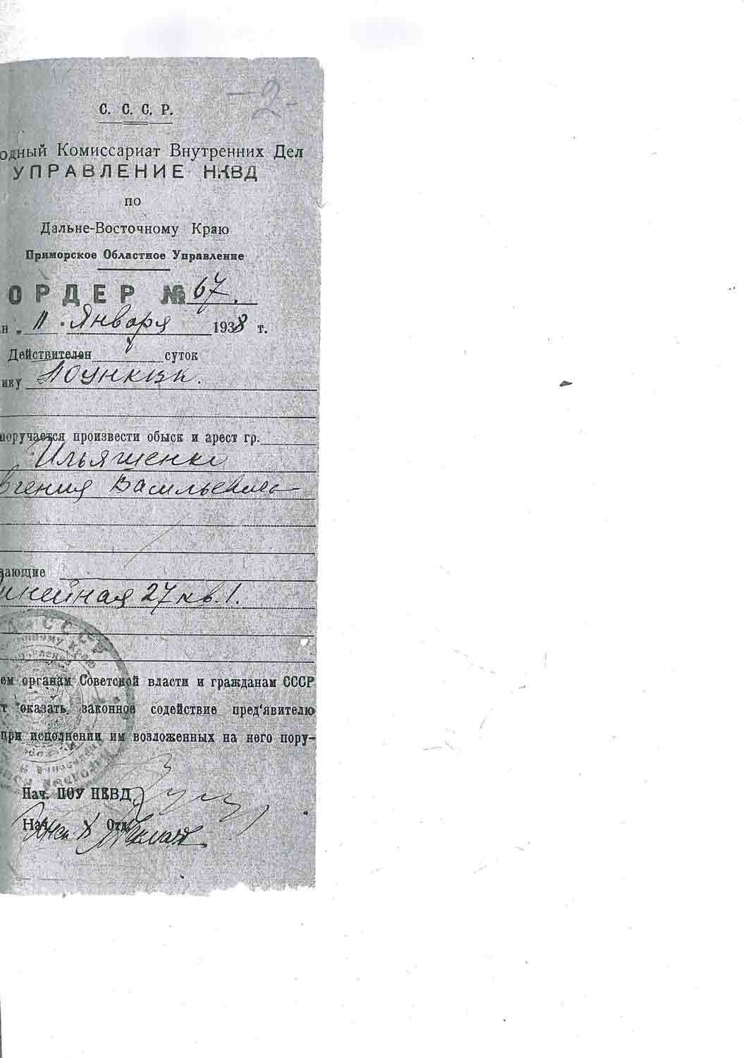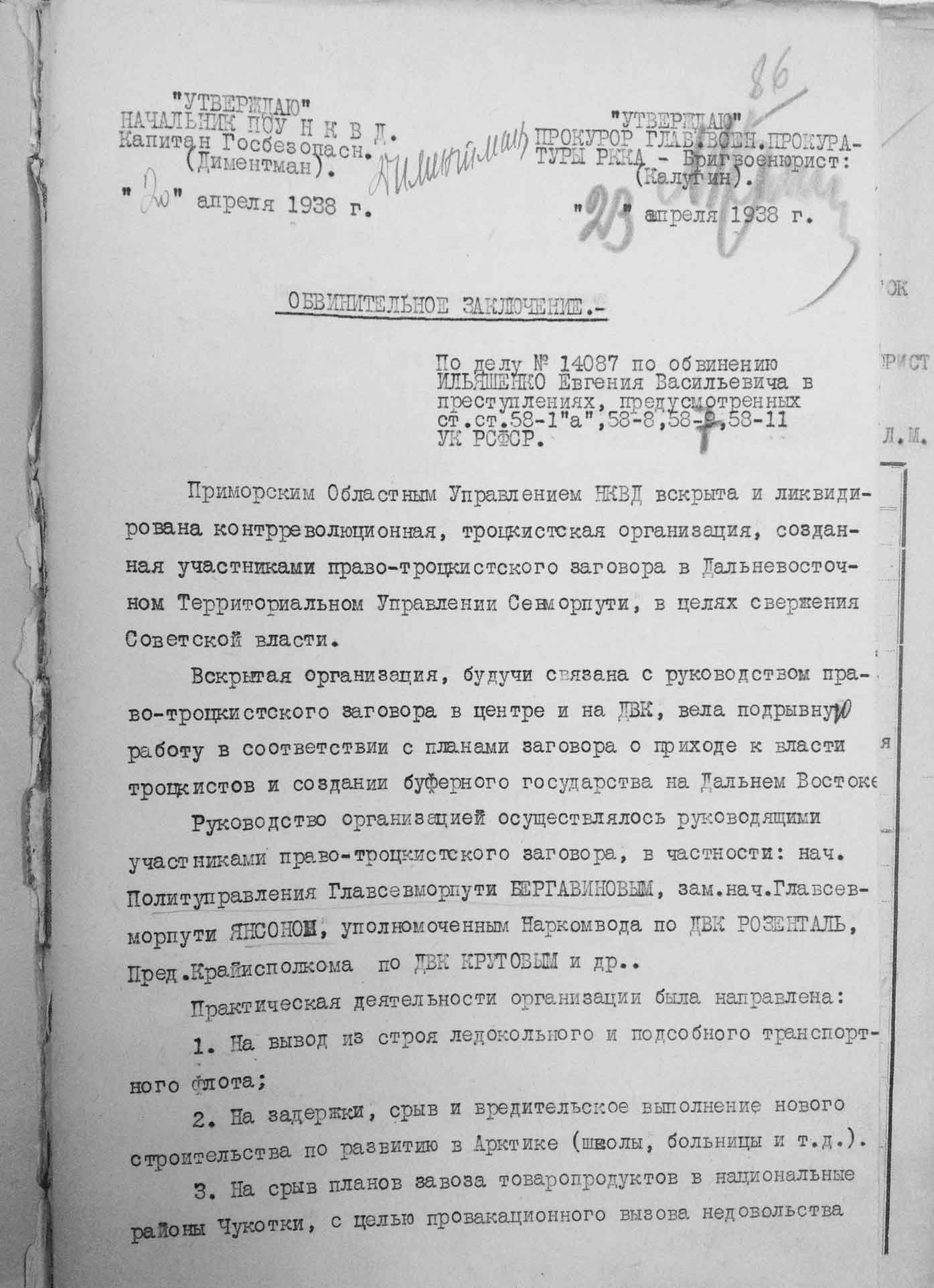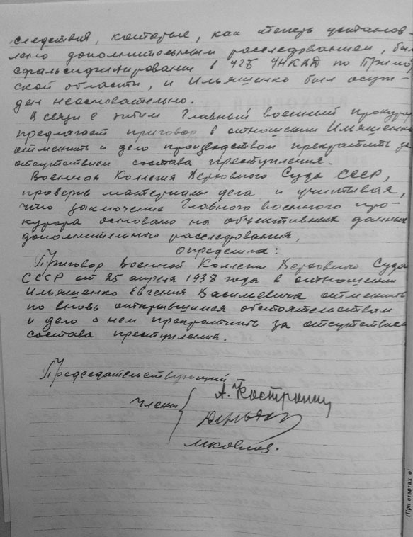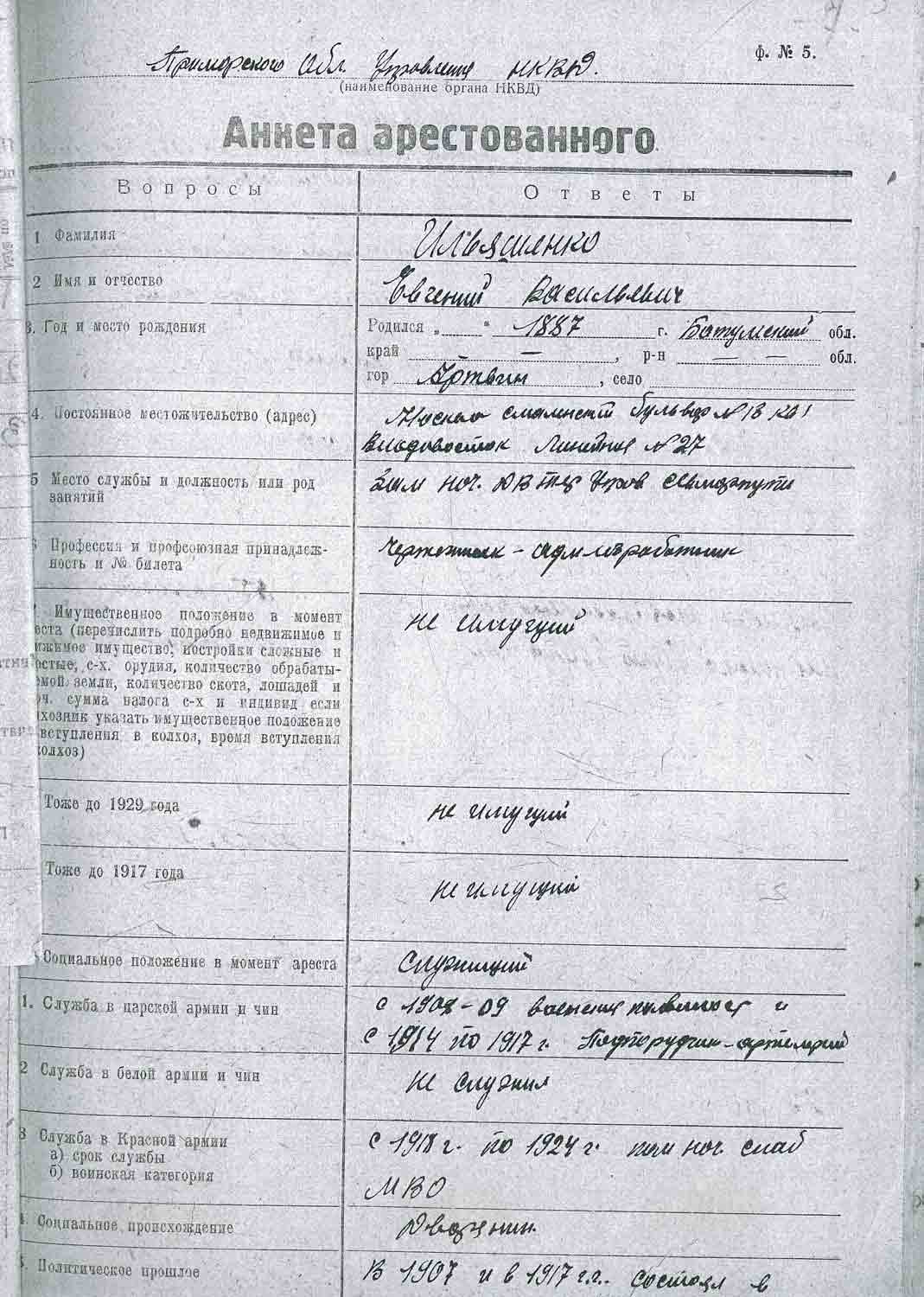 Рассмотрев решение общего закрытого партсобрания первичной парторганизации Д/В Теруправления Севморпути от 4-го ноября 1937 года/протокол № 15/ об исключении из рядов ВКП (б) ИЛЬЯШЕНКО Евгения Васильевича, год рождения 1887; соцпроисхождение из дворян. Член ВКП (б) с июля 1919 года, партбилет «1 048 417. Окончил два курса Томского технологического института. Служил в царской армии в чине прапорщика и при Керенском демобилизовался в чине подпоручика. Состоял в партии С-Р в 1906—1907 гг. и в 1917 году.