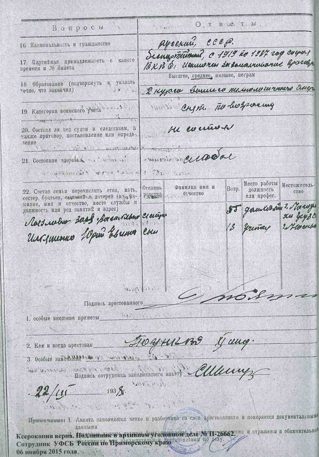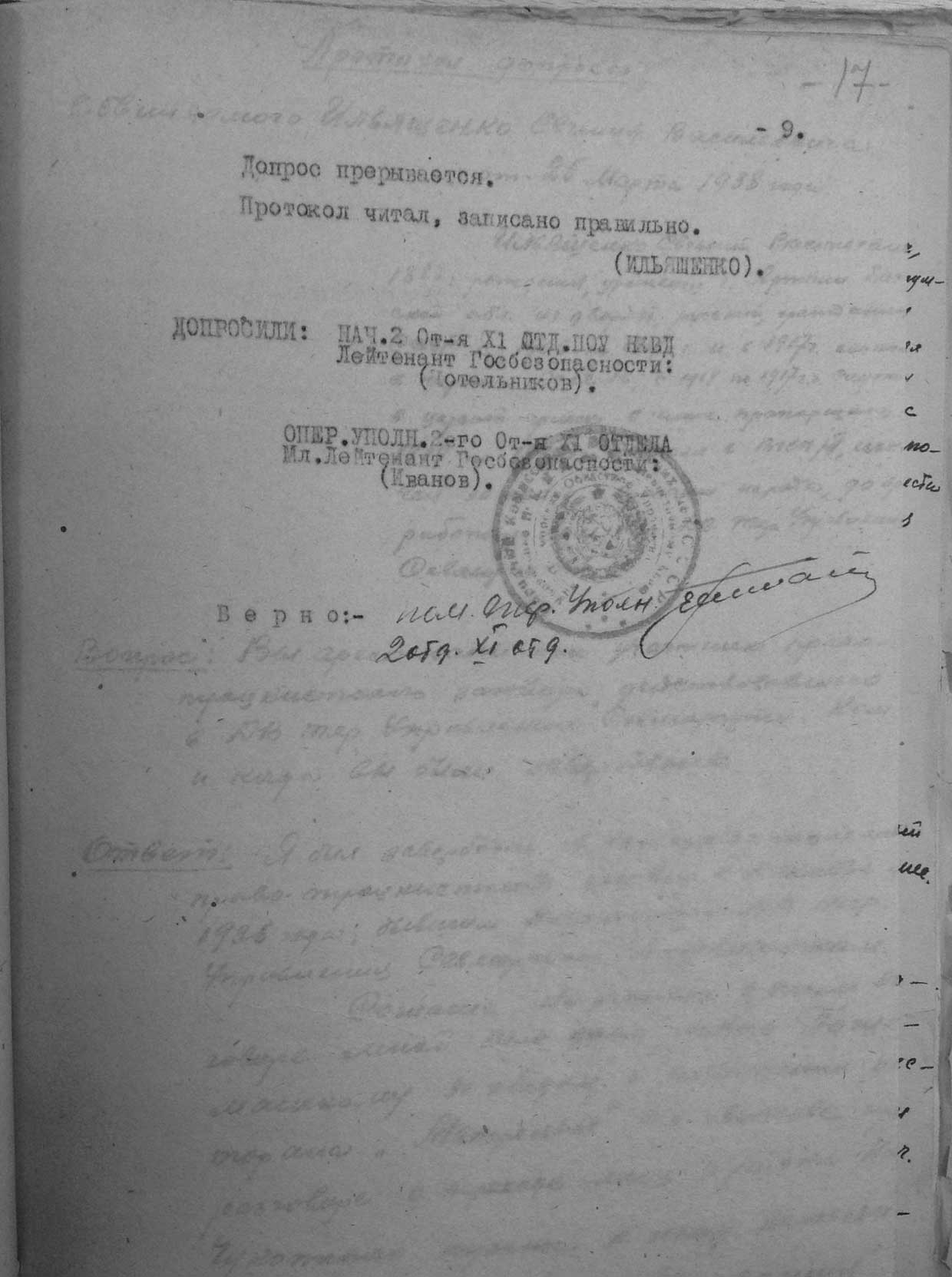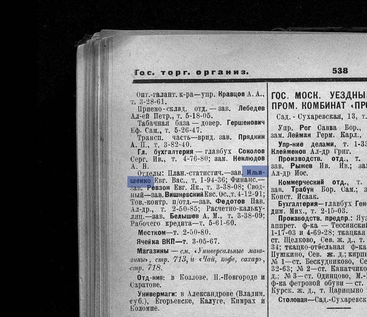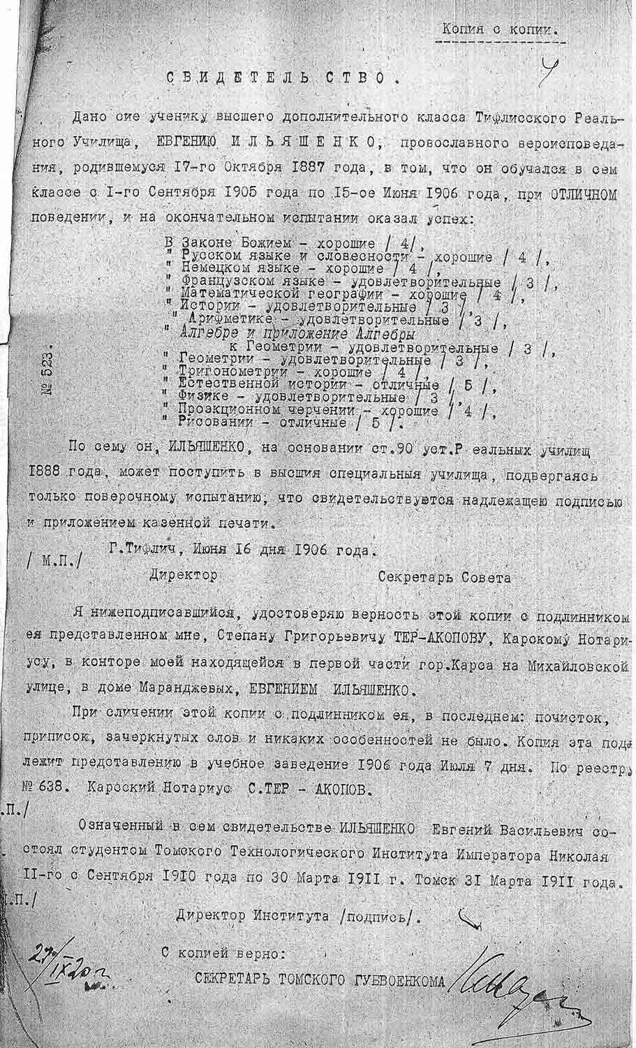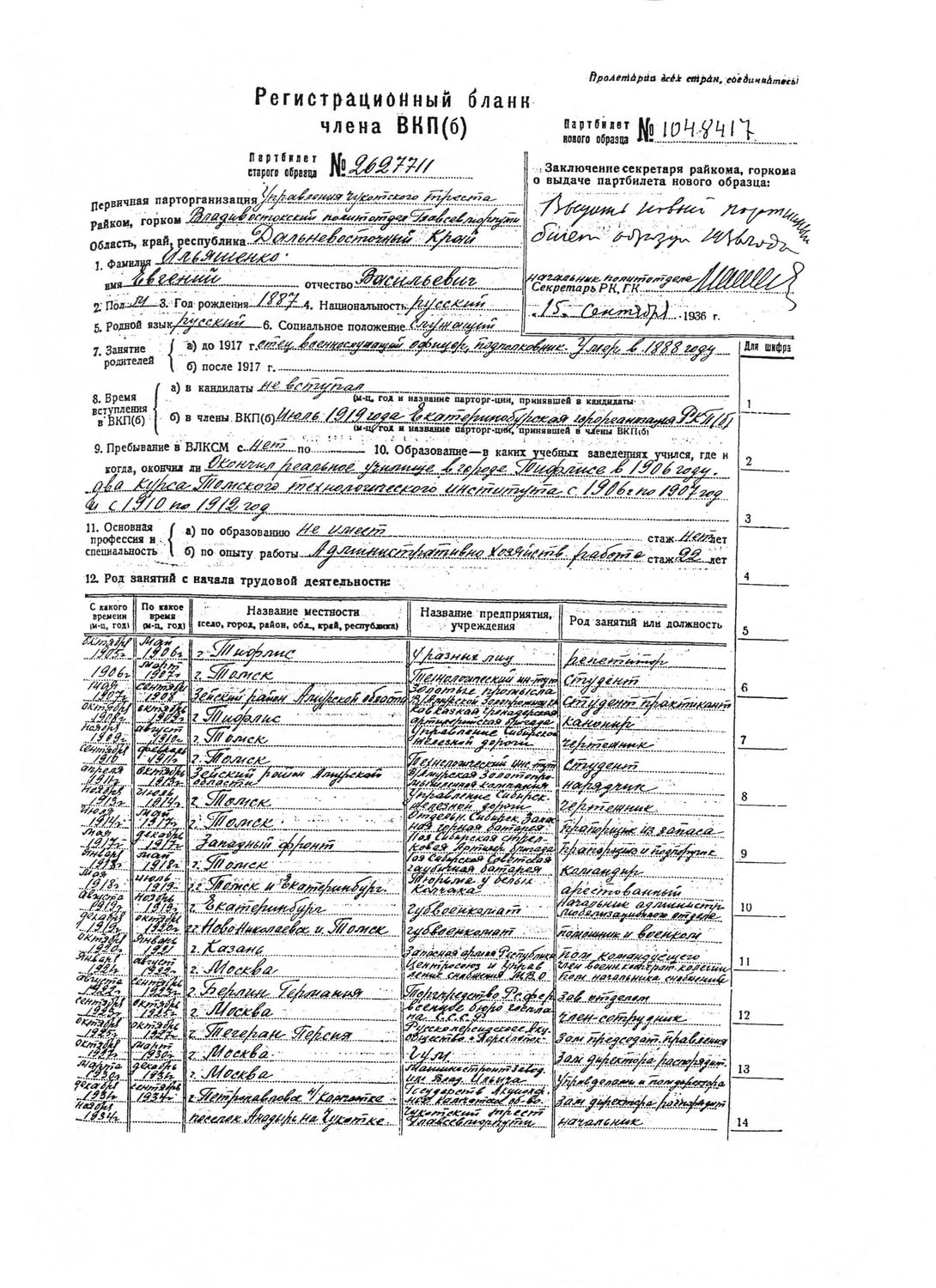 Рассмотрев решение общего закрытого партсобрания первичной парторганизации Д/В Теруправления Севморпути от 4-го ноября 1937 года/протокол № 15/ об исключении из рядов ВКП (б) ИЛЬЯШЕНКО Евгения Васильевича, год рождения 1887; соцпроисхождение из дворян. Член ВКП (б) с июля 1919 года, партбилет «1 048 417. Окончил два курса Томского технологического института. Служил в царской армии в чине прапорщика и при Керенском демобилизовался в чине подпоручика. Состоял в партии С-Р в 1906—1907 гг. и в 1917 году.