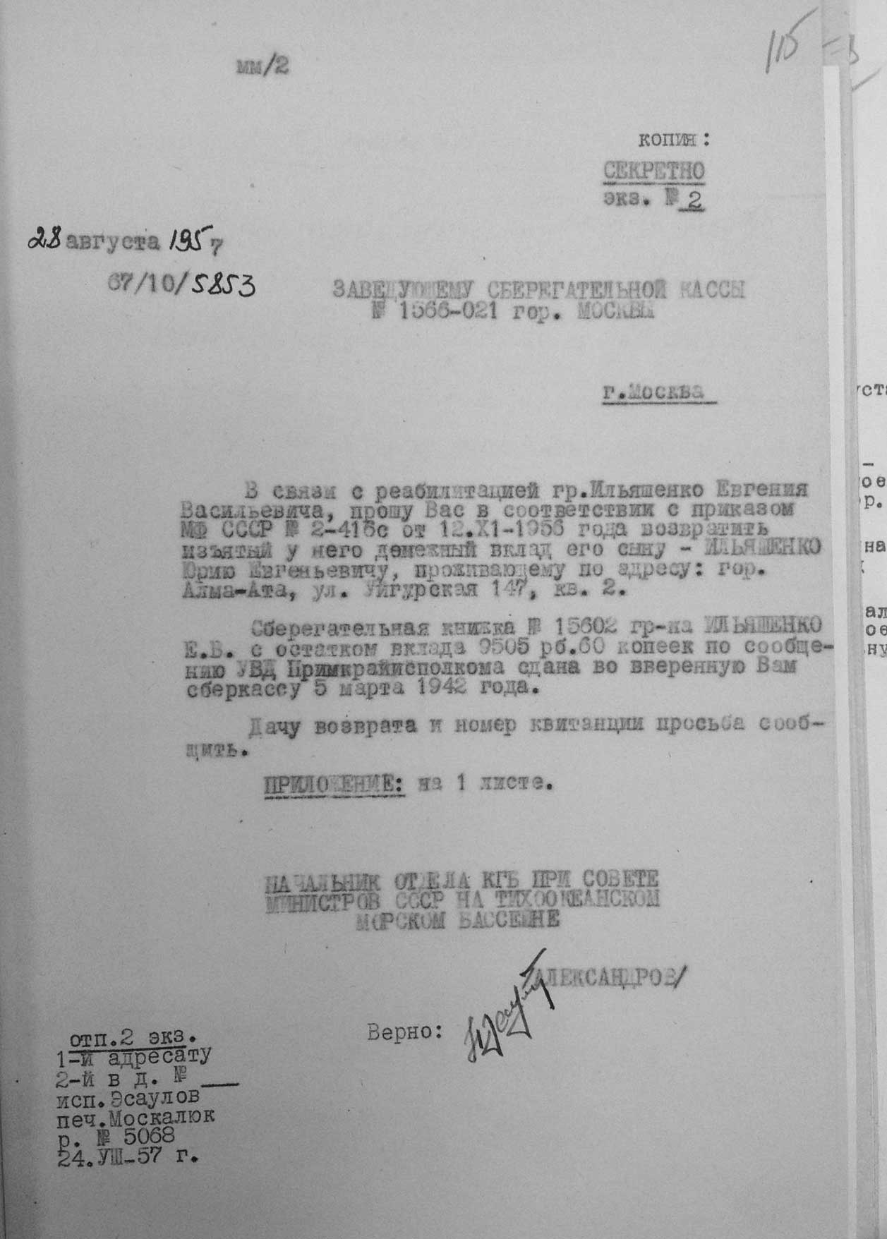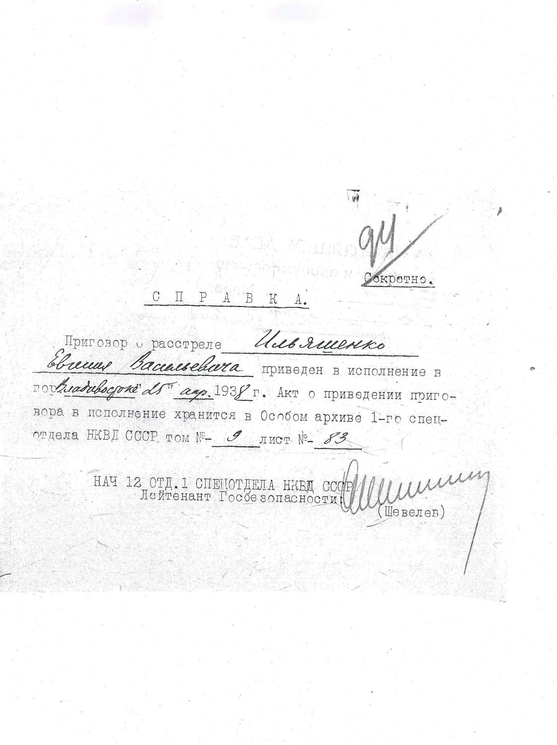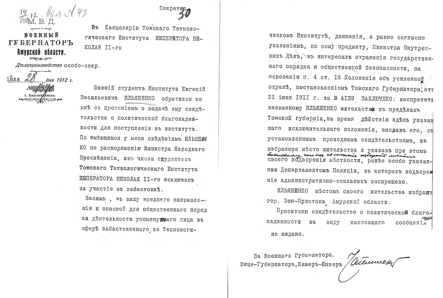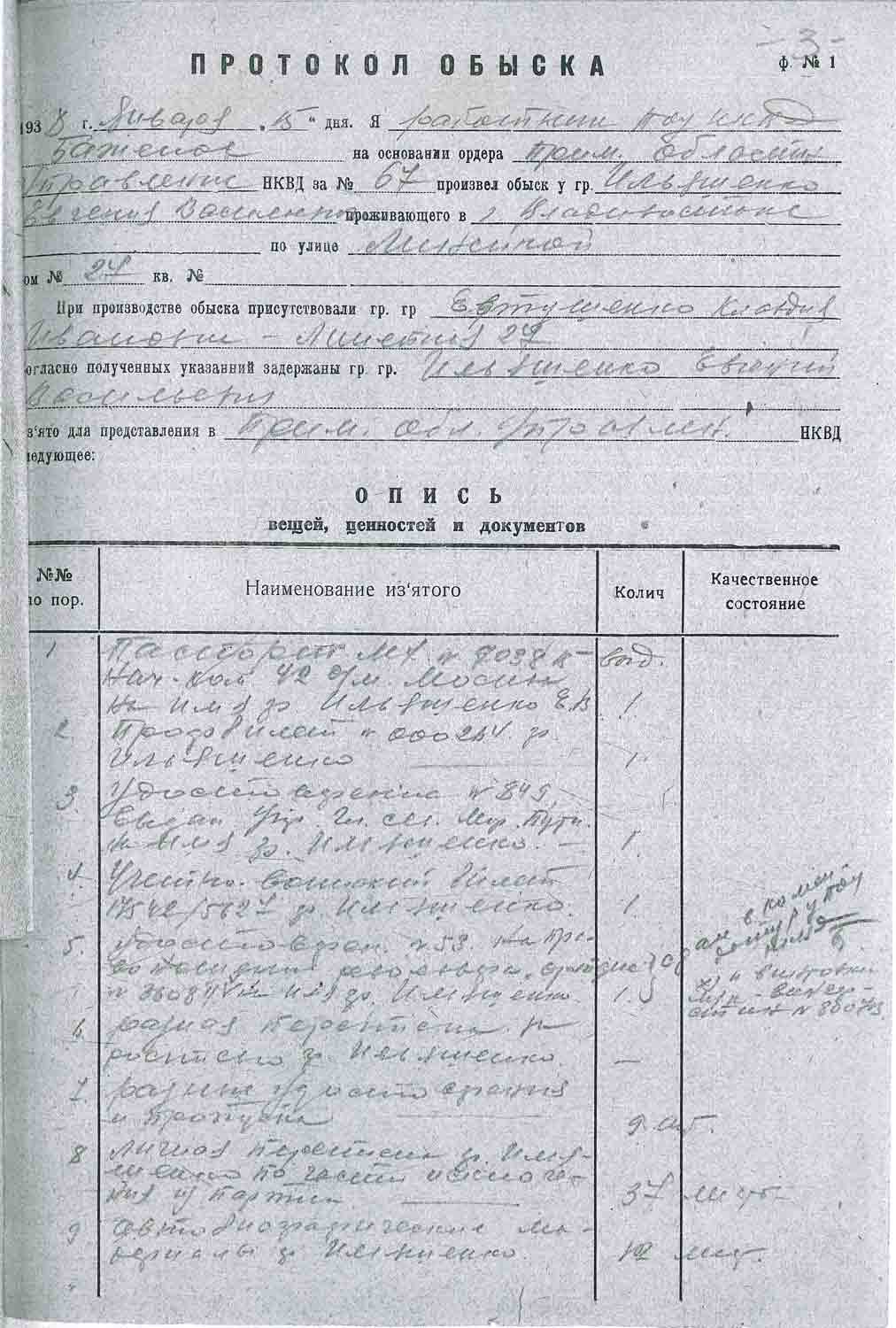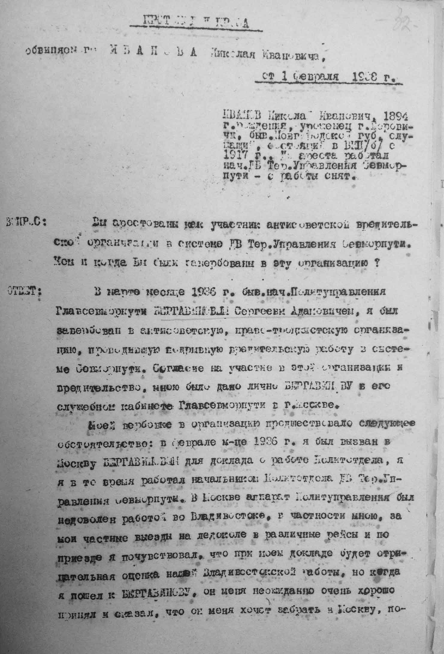 Рассмотрев решение общего закрытого партсобрания первичной парторганизации Д/В Теруправления Севморпути от 4-го ноября 1937 года/протокол № 15/ об исключении из рядов ВКП (б) ИЛЬЯШЕНКО Евгения Васильевича, год рождения 1887; соцпроисхождение из дворян. Член ВКП (б) с июля 1919 года, партбилет «1 048 417. Окончил два курса Томского технологического института. Служил в царской армии в чине прапорщика и при Керенском демобилизовался в чине подпоручика. Состоял в партии С-Р в 1906—1907 гг. и в 1917 году.