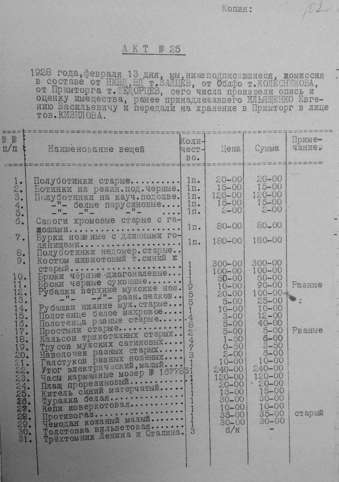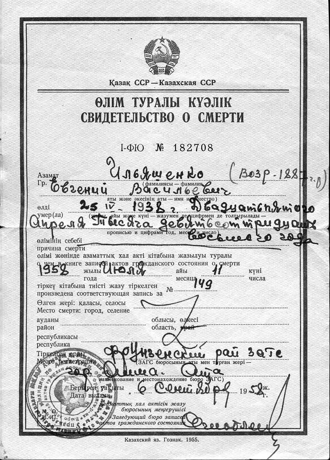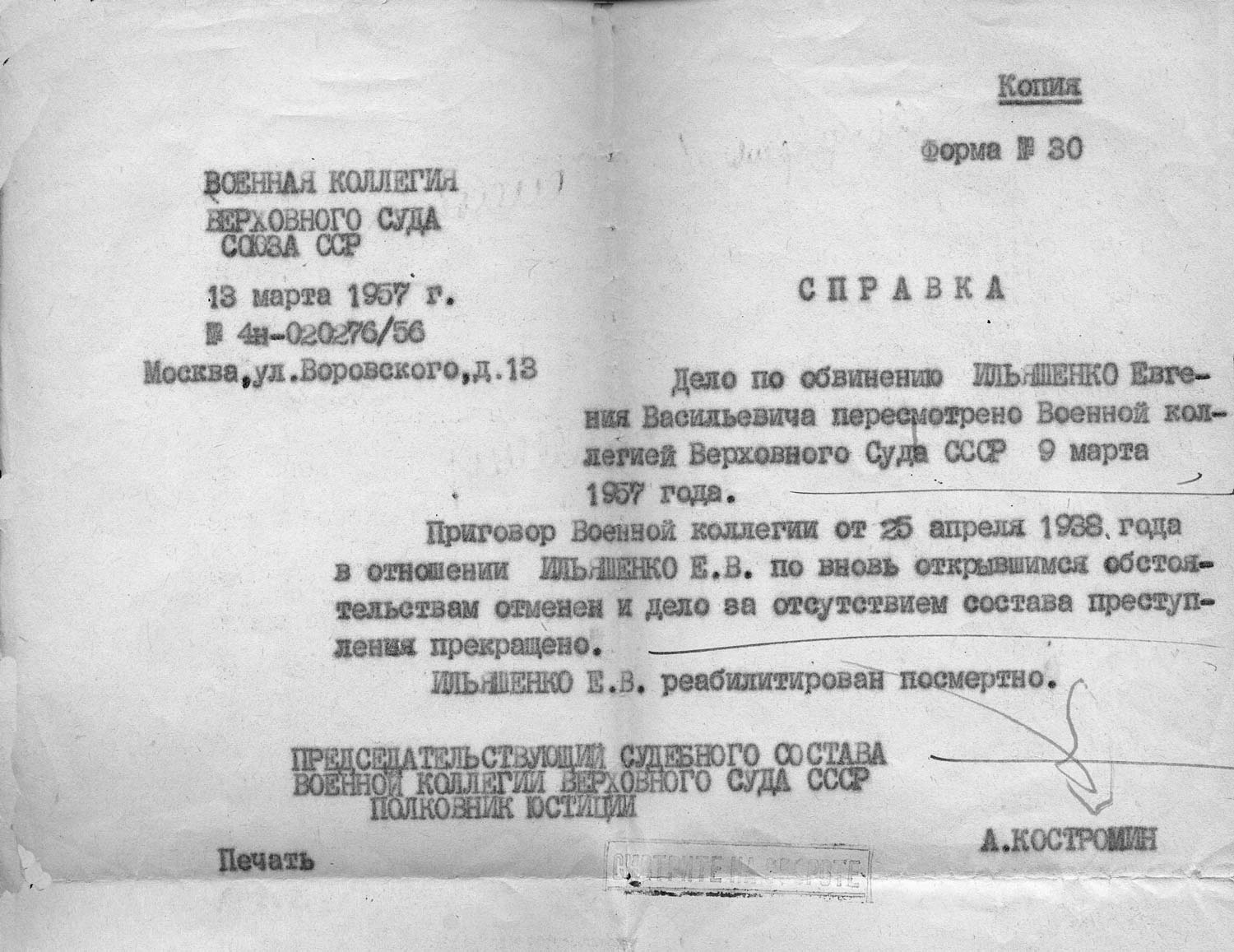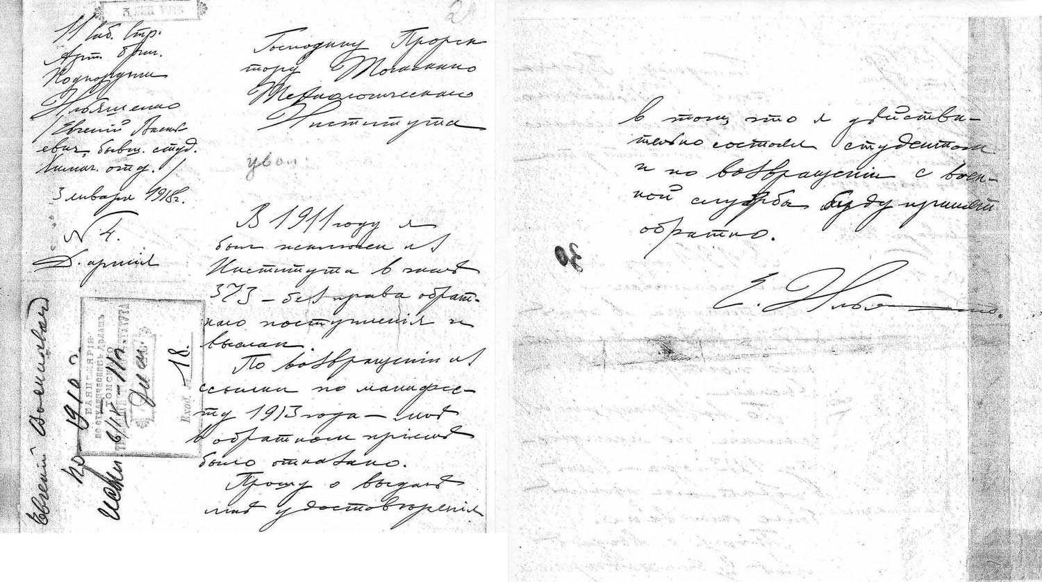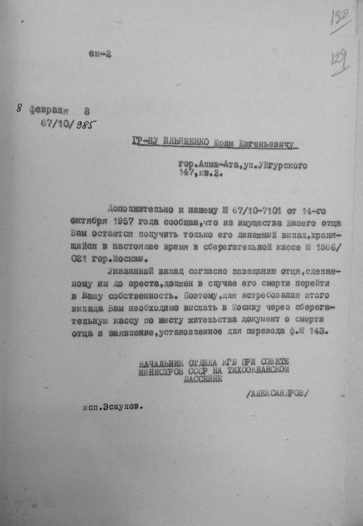 Рассмотрев решение общего закрытого партсобрания первичной парторганизации Д/В Теруправления Севморпути от 4-го ноября 1937 года/протокол № 15/ об исключении из рядов ВКП (б) ИЛЬЯШЕНКО Евгения Васильевича, год рождения 1887; соцпроисхождение из дворян. Член ВКП (б) с июля 1919 года, партбилет «1 048 417. Окончил два курса Томского технологического института. Служил в царской армии в чине прапорщика и при Керенском демобилизовался в чине подпоручика. Состоял в партии С-Р в 1906—1907 гг. и в 1917 году.