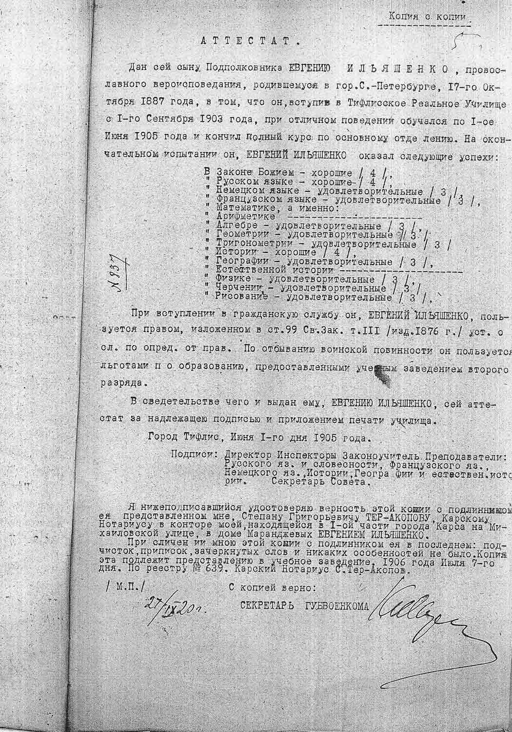 1 сентября 1903 года Евгений Ильяшенко поступил в Тифлисское реальное училище, где проучился до 15 июня 1906 года.