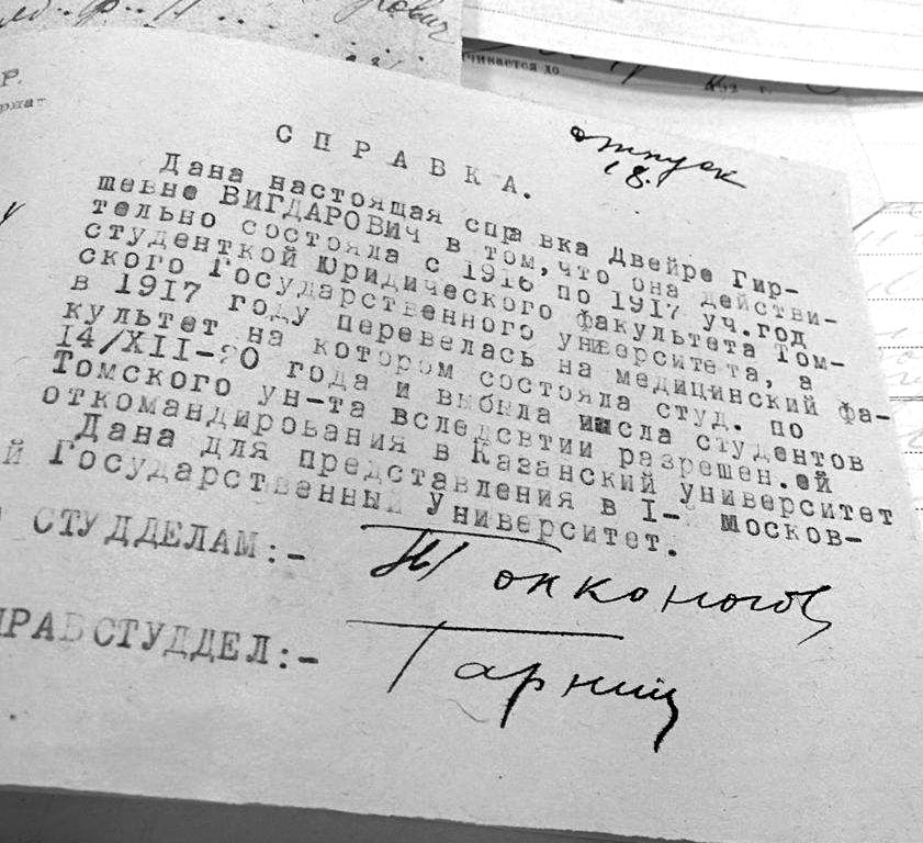 13. Справка на имя Двейры Гиршены Вигдорович. Архив Томского государственного университета.
