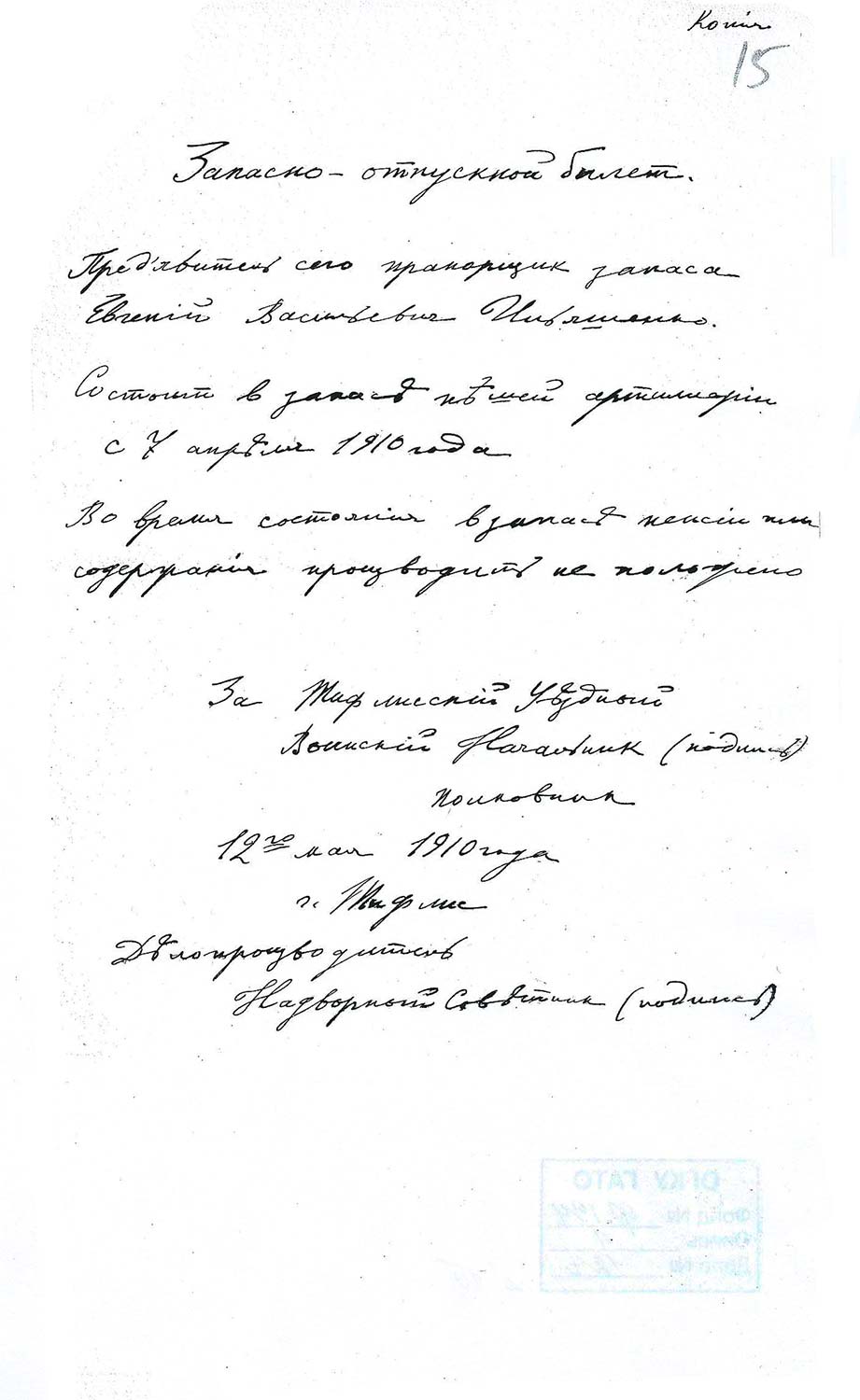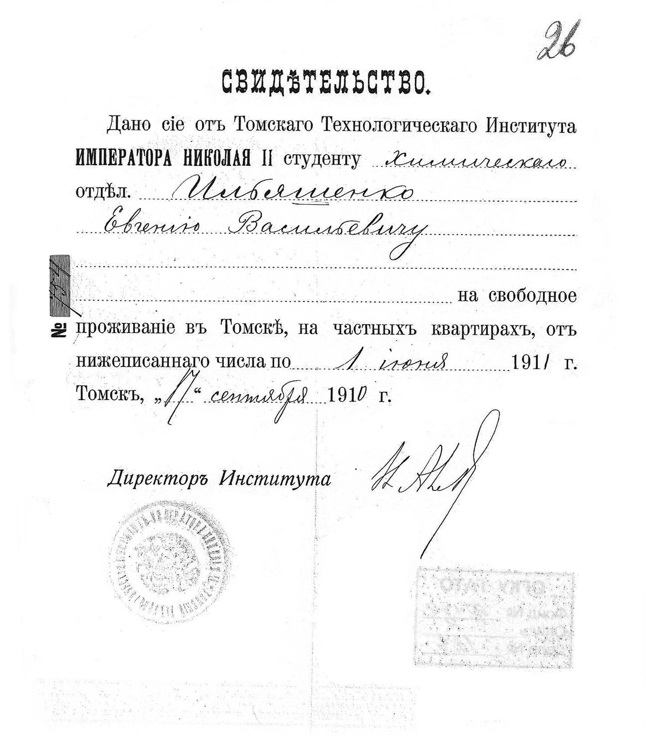 2.7 Свидетельство на свободное проживание в Томске от 17 сентября 1910 г. Государственный архив Томской области. Ф. 194. Оп. 4. Д. 128. с. 28.