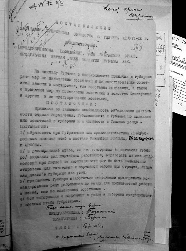 3.11. Постановление заседания губревкома соместно с губчека от 21 июля 1920 г. Государственный архив Томской области. Фонд Р. 521. Оп. 1. Д. 51. Лист 569.