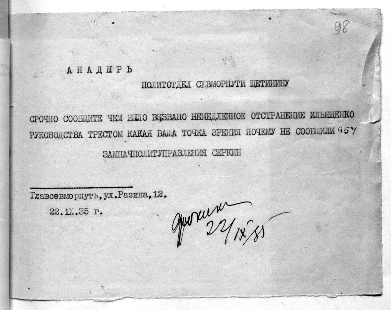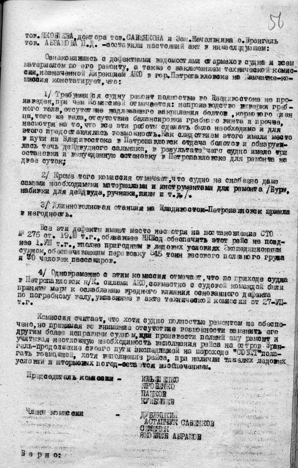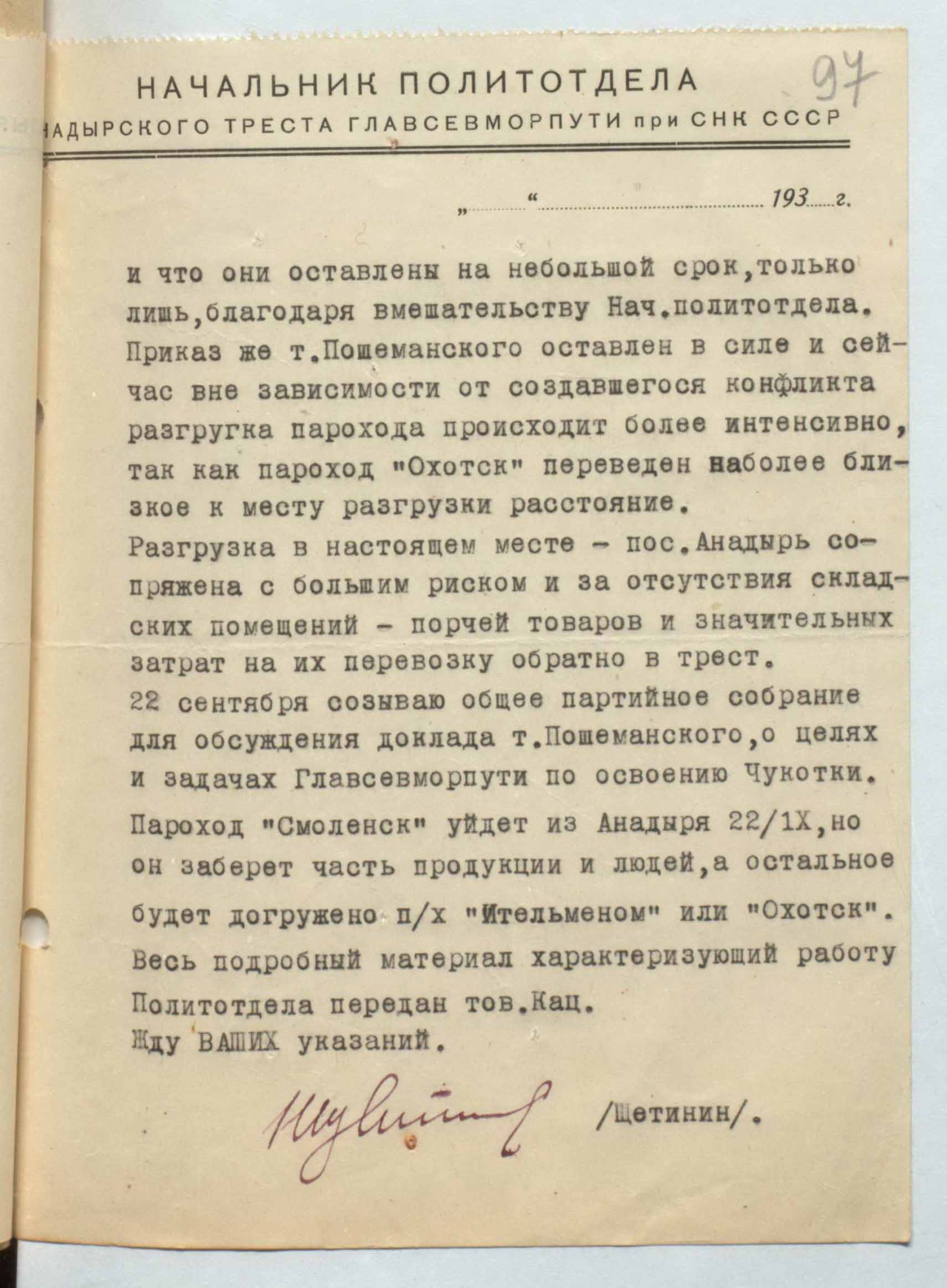 и что они оставлены на небольшой срок, только лишь, благодаря вмешательству Нач.политотдела. Приказ же т. Пошеманского оставлен в силе и сейчас вне зависимости от создавшегося конфликта разгрузка парохода происходит более интенсивно, так как пароход «Охотск» переведен наиболее близкое к месту разгрузки состояние. Разгрузка в настоящем месте — пос. Анадырь сопряжена с большим риском и за отсутствия складских помещений — порчей товаров и значительных затрат на их перевозку обратно в трест. 22 сентября созываю общее партийное собрание для обсуждения доклада т. Пошеманского, о целях и задачах Главсевморпути по освоению Чукотки. Пароход «Смоленск» уйдет из Анадыря 22/1Х, но он заберет часть продукции и людей, а остальное будет догружено п/х «Ительменом» или «Охотск». Весь подробный материал характеризующий работу Политотдела передан тов. Кац. Жду ВАШИХ указаний