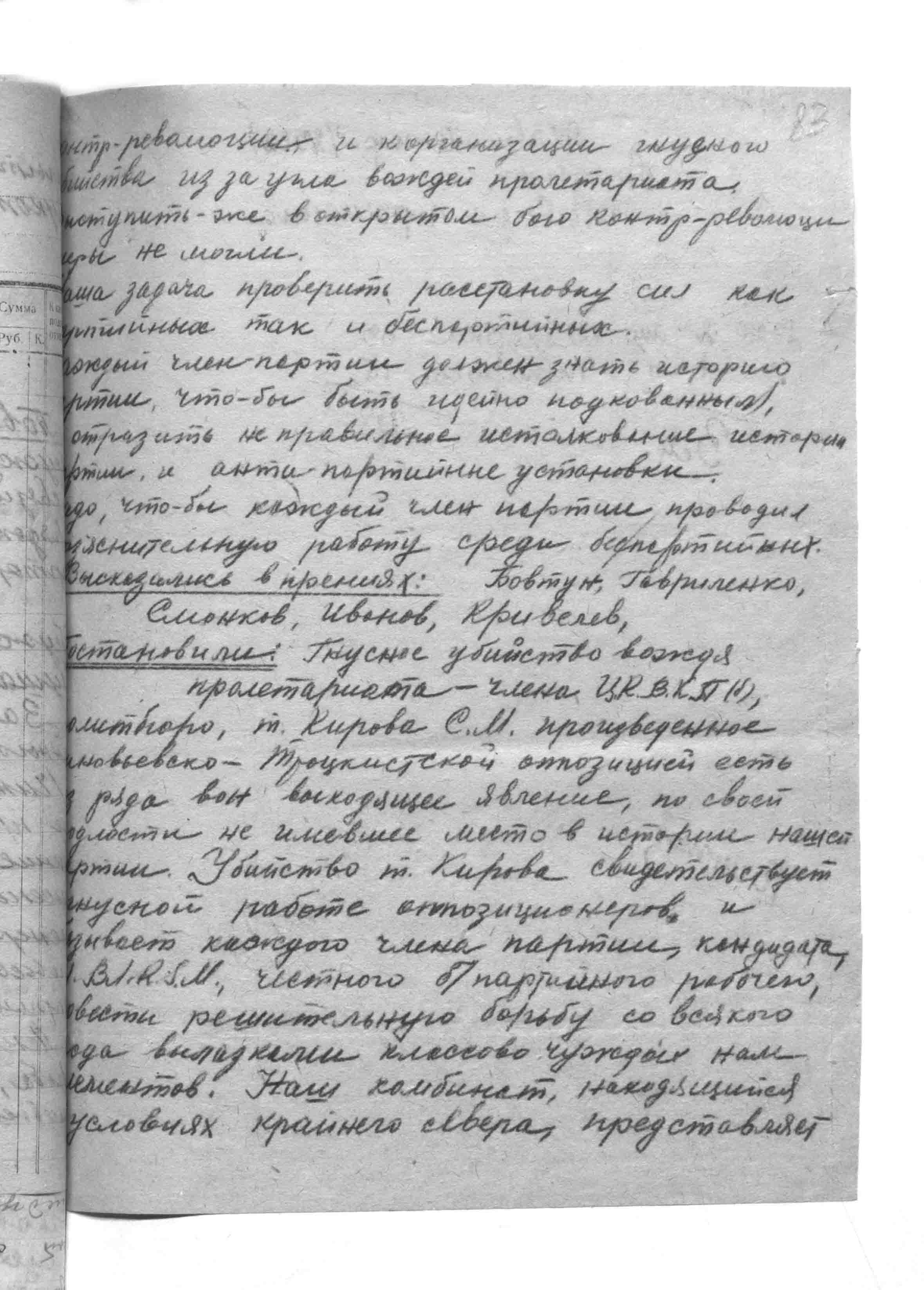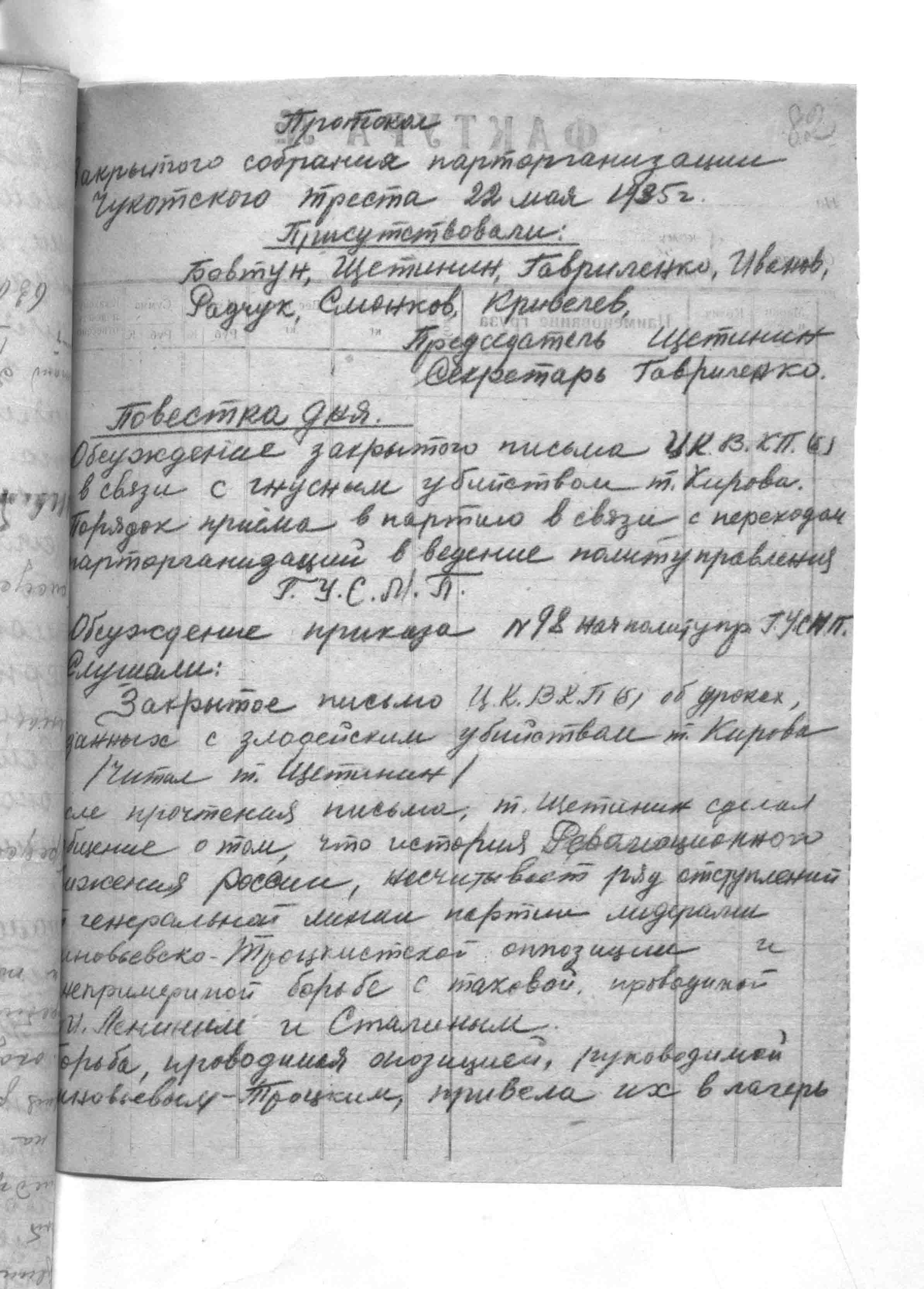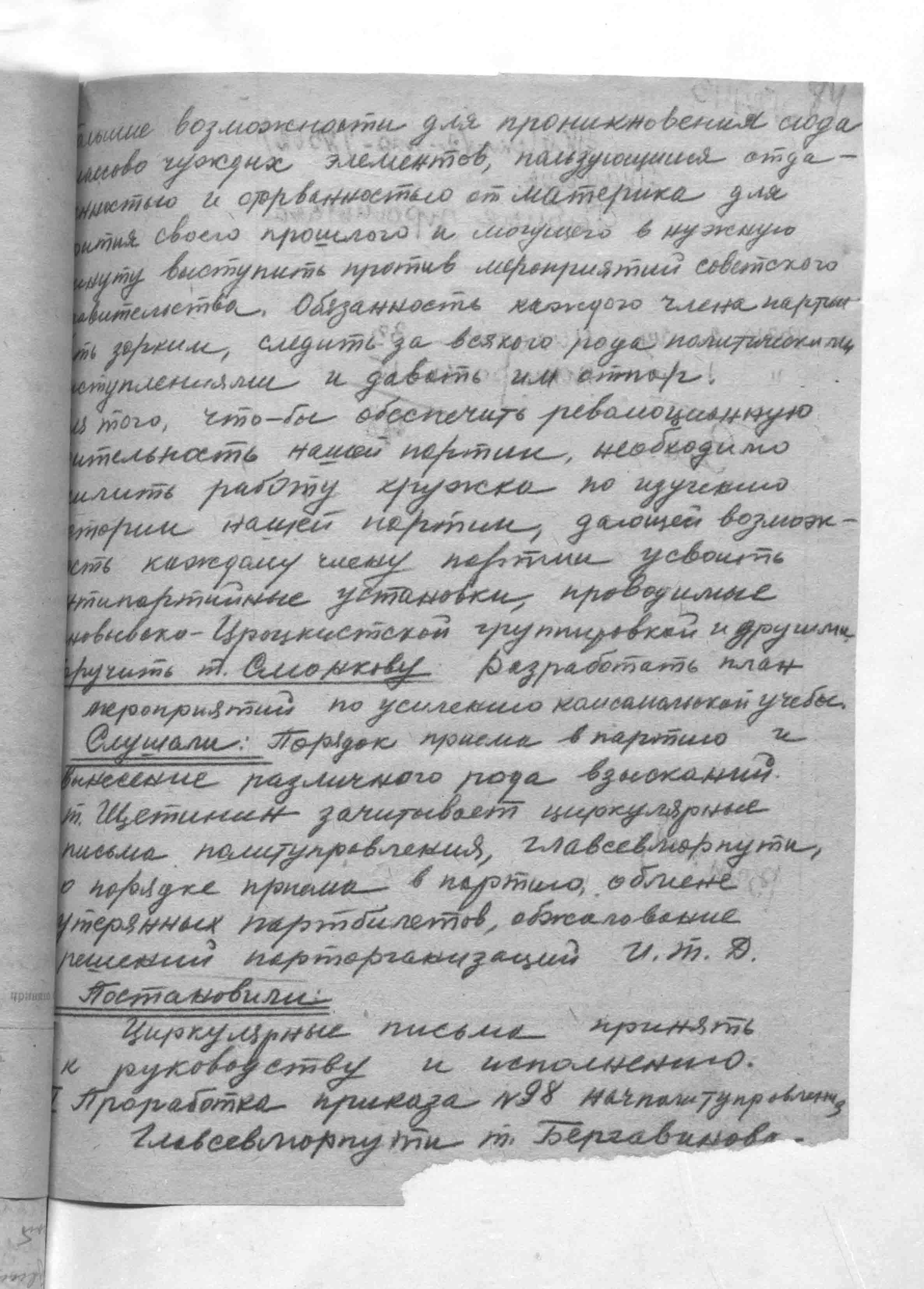 большие возможности для проникновения сюда классово чуждых элементов, пользующихся отдаленностью и оторванностью от материка для прикрытия своего прошлого и могущего в нужную минуту выступить против мероприятий советского правительства. Обязанность каждого члена партии быть зорким, следить за всякого рода политическими отступлениями и давать им отпор. Для того, что-бы обеспечить революционную деятельность нашей партии, необходимо усилить работу кружка по изучению истории нашей партии, дающей возможность каждому члену партии усвоить антипартийные установки, проводимые Зиновьевско-Троцкистской группировкой и другими. Поручить т. Смонкову Разработать план мероприятий по усилению комсамольской учебы.