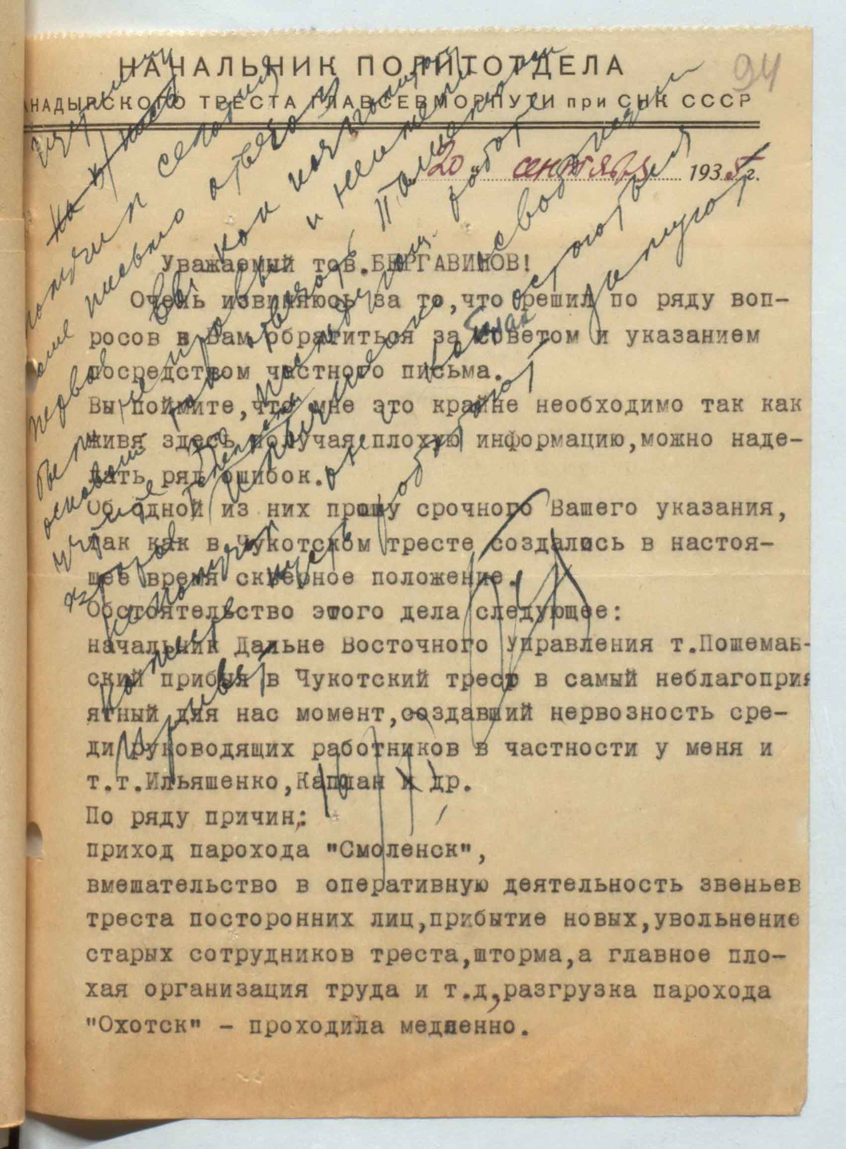 Очень извиняюсь за то, что решил по ряду вопросов б Вам обратиться за советом и указанием посредством частного письма. Вы поймите, что мне это крайне необходимо так как живя здесь получая плохую информацию, можно наделать ряд ошибок. Об одной из них прошу срочно Вашего указания, так как в Чукотском тресте создалось в настоящее время скверное положение. Обстоятельство этого дела следующее: начальник Дальне Восточного Управления т. Пошеманский прибыл в Чукотский трест в самый неблагоприятный для нас момент, создавший нервозность среди руководящих работников в частности у меня и т.т. Ильяшенко, Каплан и др.