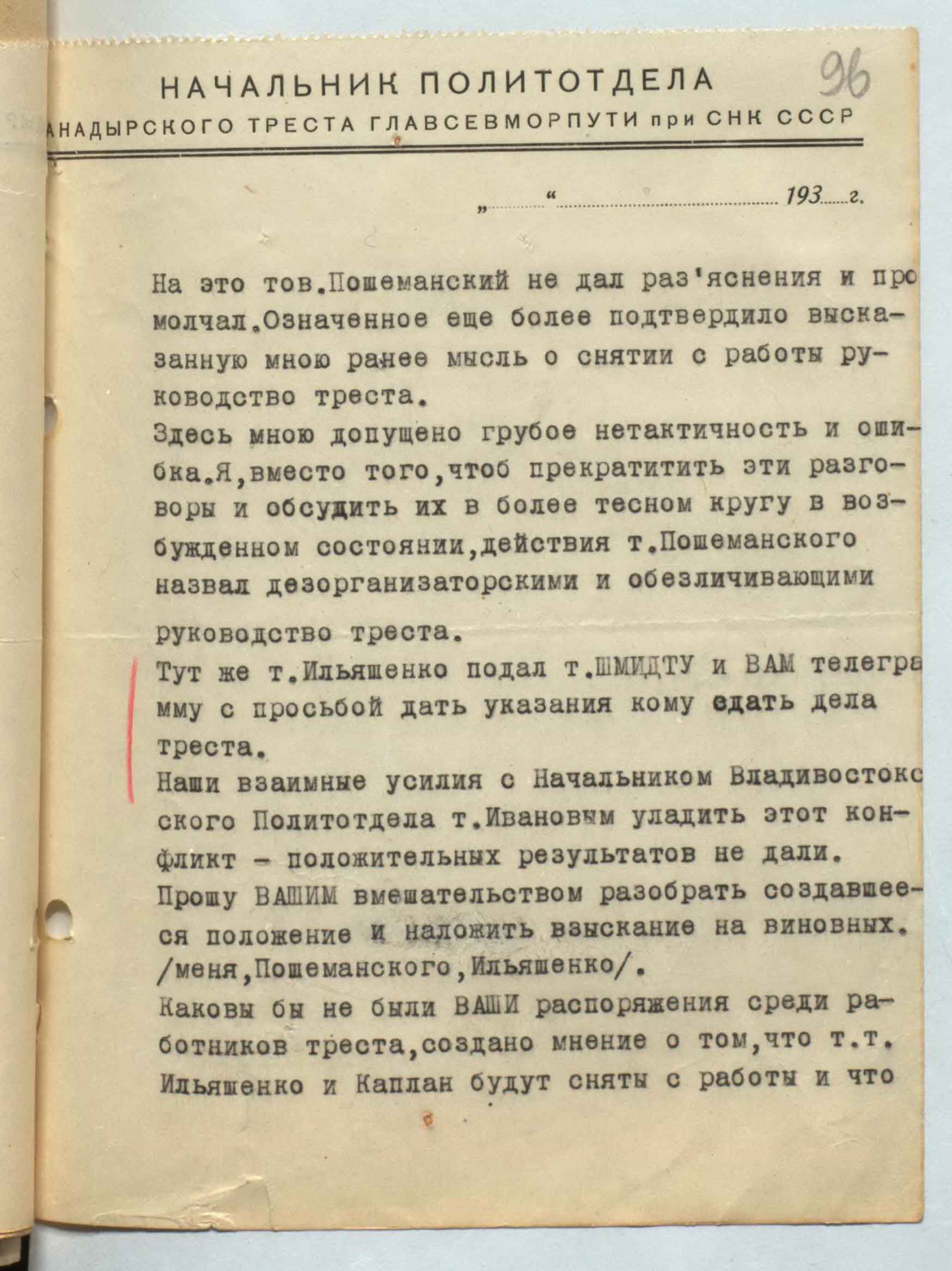 На это тов. Пошеманский не дал раз’яснения и промолчал. Означенное еще более подтвердило высказанную мною ранее мысль о снятии с работы руководство треста. Здесь мною допущено грубое нетактичность и ошибка. Я, вместо того, чтоб прекратить эти разговоры и обсудить их в более тесном кругу в возбужденном состоянии, действия т. Пошеманского назвал дезорганизаторскими и обезличивающими руководство треста. |Тут же т. Ильяшенко подал т. ШМИДТУ и ВАМ телеграмму с просьбой дать указания |кому сдать дела треста. Наши взаимные усилия с Начальником Владивостокского Политотдела т. Ивановым уладить этот конфликт — положительных результатов не дали. Прошу ВАШИМ вмешательством разобрать создавшееся положение и наложить взыскание на виновных. /меня, Пошеманского, Ильяшенко/. Каковы бы ни были ВАШИ распоряжения среди работников треста, создано мнение о том, что т.т. Ильяшенко и Каплан будут сняты с работы и что
