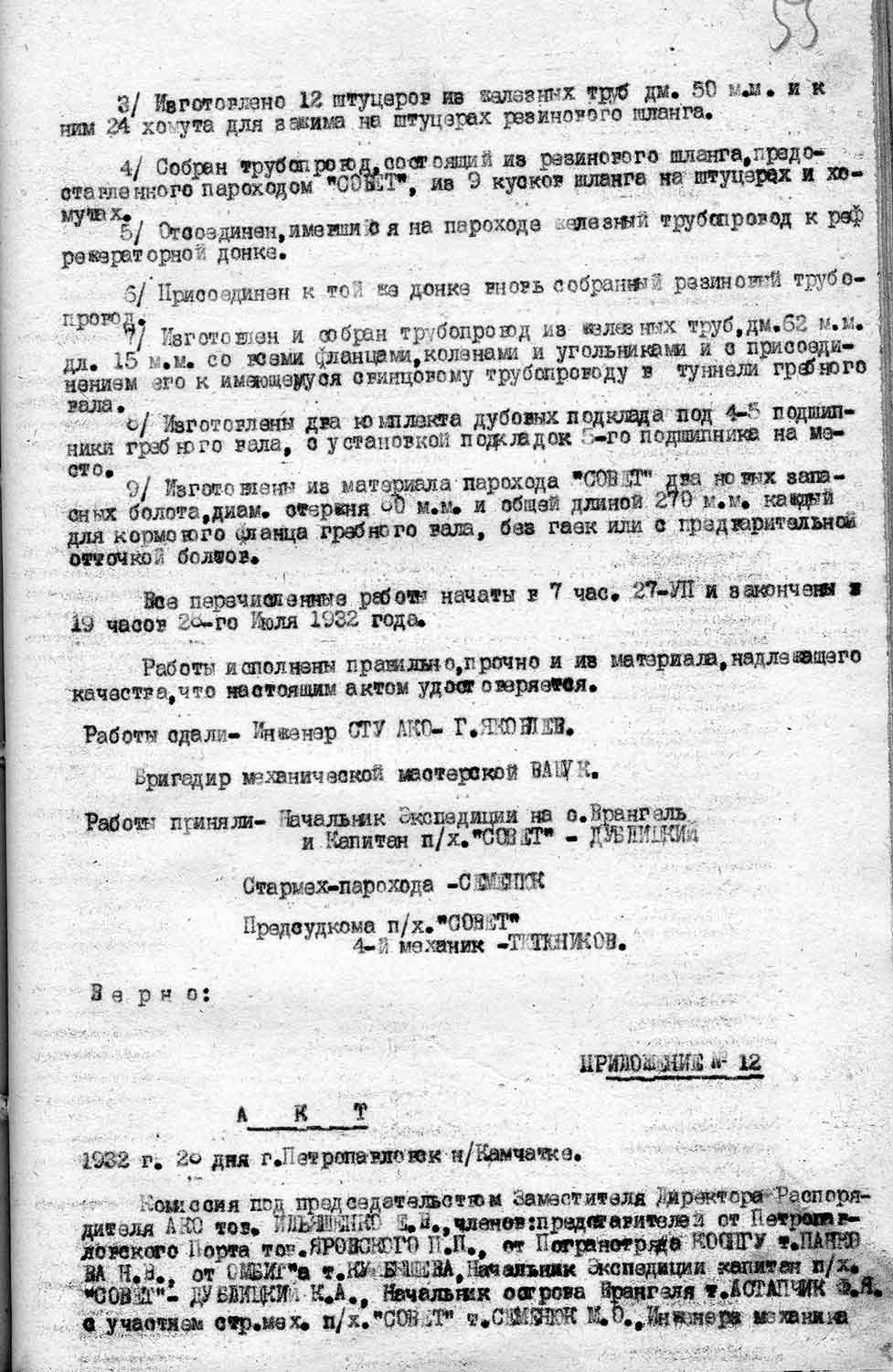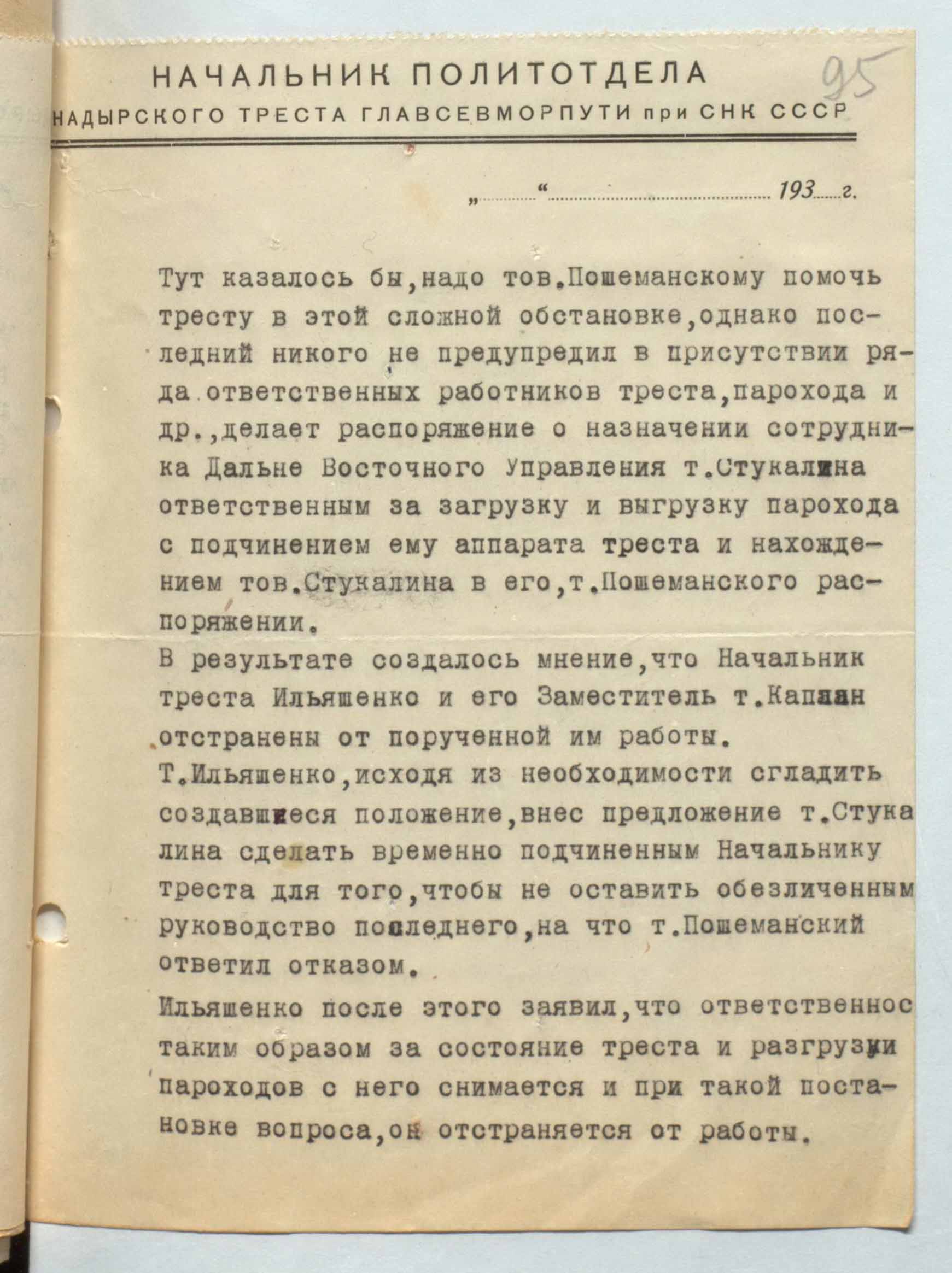 Тут казалось бы, надо тов. Пошеманскому помочь тресту в этой сложной обстановке, однако последний никого не предупредил в присутствии ряда ответственных работников треста, парохода и др., делает распоряжение о назначении сотрудника Дальне Восточного Управления т. Стукалина ответственным за загрузку и выгрузку парохода с подчинением ему аппарата треста и нахождением тов. Стукалина в его, т. Пошеманского распоряжении. В результате создалось мнение, что Начальник треста Ильяшенко и его Заместитель т. Каплан отстранены от порученной им работы. Т. Ильяшенко, исходя из необходимости сгладить создавшиеся положение, внес предложение т. Стукалина сделать временно подчиненным Начальнику треста для того, чтобы не оставить обезличенным руководство последнего, на что т. Пошеманский ответил отказом. Ильяшенко после этого заявил, что ответственнос таким образом за состояние треста и разгрузки пароходов с него снимается и при такой постановке вопроса, он отстраняется от работы.